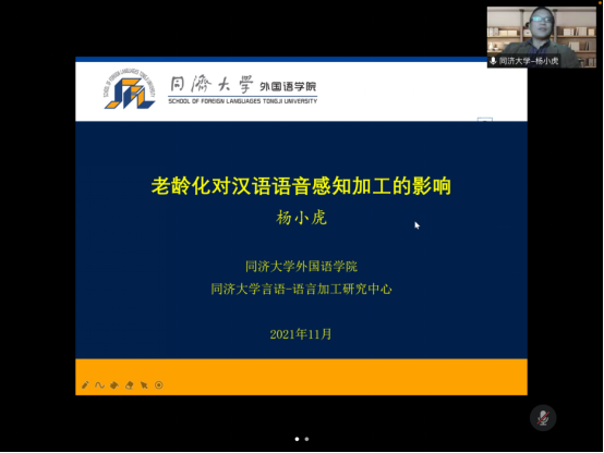 首先,同济大学外国语学院博士生导师杨小虎教授通过线上方式作了题为《老龄化对汉语语音感知加工的影响》的报告,介绍了老年人在不同听力环境下对普通话辅音、元音、声调、韵律的感知加工表现,探讨了注意控制能力变化对其语音加工表现的影响,指出了言语感知老龄化具有复杂的内在机理。在随后的问答环节中,与会师生就自己的疑问与杨小虎教授进行交流互动,杨教授作了深入浅出的专业解答,极大地激发了与会师生的研究思路与研究热情。