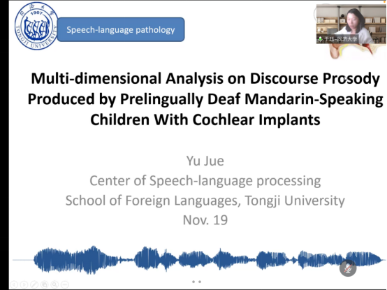 然后,同济大学外国语学院博士生导师于珏副教授带来了题为《人工耳蜗植入儿童口语语篇的多维韵律特征分析》的线上报告。于教授介绍了耳蜗儿童口语产出中的语篇韵律特征,揭示了汉语普通话耳蜗儿童在连续语流中节奏及旋律加工的偏好策略,指出了人工耳蜗植入能有效提升听障人群的言语感知能力和产出能力,但在韵律边界处表现出停顿及延长调控的任意性;耳蜗儿童在语流旋律方面对局部音高线索的调控存在明显不足,在整体语篇的音高下倾及音高重置则出现非典型性表现,从而无法有效地运用韵律线索指示语篇结构。