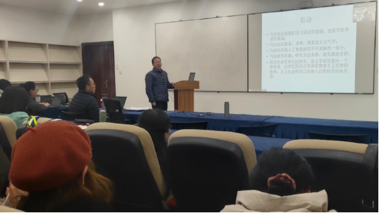 交叉学科讲坛结束之际,姜孟教授进行了总结,感谢周统权教授带来的精彩报告,并特别指出此次报告将语言学与人工智能结合,颇具科学性和前沿性,拓宽了师生对句法知识和语言研究的视野。本次活动在热烈的掌声中落下帷幕。
